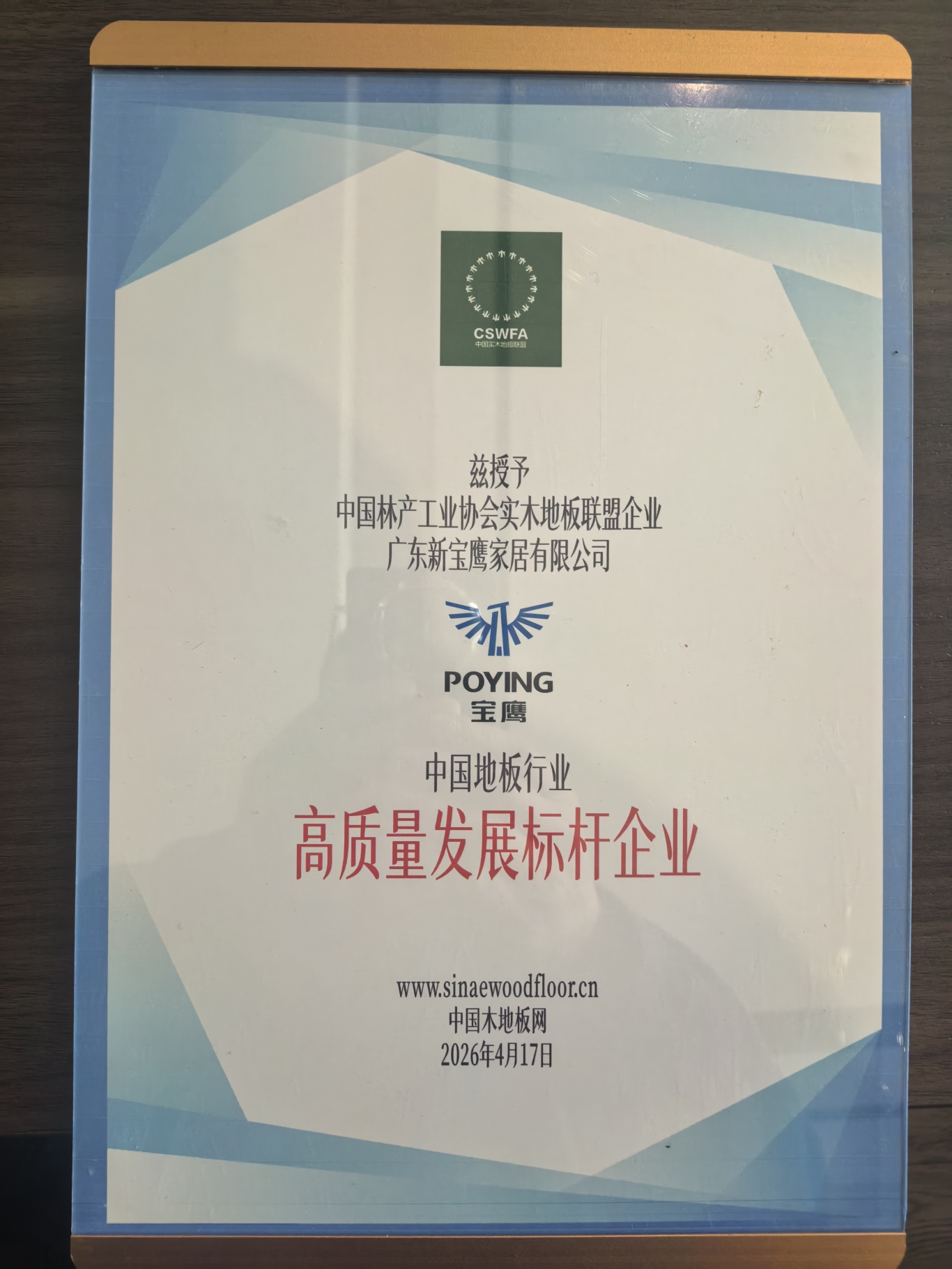 當(dāng)匠心遇見(jiàn)認(rèn)可,當(dāng)品質(zhì)鑄就標(biāo)桿,寶鷹地板再添行業(yè)殊榮!2026 年 4 月 17 日,中國(guó)林產(chǎn)工業(yè)協(xié)會(huì)實(shí)木地板聯(lián)盟年度工作會(huì)議在南潯盛啟。廣東新寶鷹家居有限公司(寶鷹地板)憑借深耕實(shí)木地板領(lǐng)域的深厚積淀、持續(xù)領(lǐng)跑的創(chuàng)新實(shí)力與引領(lǐng)行業(yè)高質(zhì)量發(fā)展的責(zé)任擔(dān)當(dāng),榮膺  “ 中國(guó)地板行業(yè)高質(zhì)量發(fā)展標(biāo)桿企業(yè) ”  稱號(hào),以實(shí)力鐫刻榮耀,用匠心續(xù)寫華章。